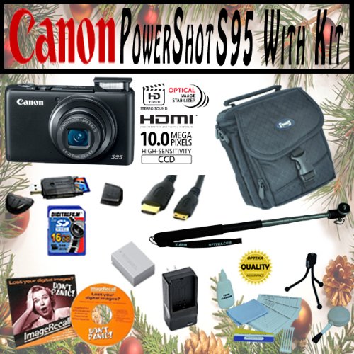 - Kit Includes: Canon PowerShot S95 10MP Digital Camera, Camera and Accessory case, Opteka X-arm, Extra NB-6L Battery Pack + 1 Hour AC/DC Battery Charger, 5 Piece cleaning kit, Image recovery disc, Mini-HDMI cable, 16Gb SD card with reader.