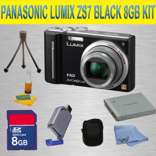 Product DescriptionThis Kit Includes:1- Panasonic LUMIX DMC-ZS7 Digital Camera (Black) (Includes manufacturer's supplied accessories)1- 8GB SDHC Memory Card1- USB Memory Card Reader1- Rechargeable Lithium Ion Replacement Extended Life Battery1- Soft carrying case1- Lens/LCD Cleaning Kit1-Table Top Tripod More about this camera:The Panasonic Lumix DMC-ZS7 is a full-featured, compact digital camera with full high-definition video recording built-in. Available in 4 bold colors, the stylish ergonomic body is easy to carry and fun to use. The camera's 12.1 megapixel image sensor captures all of your memories with rich color and remarkable detail. An integrated GPS unit automatically records location information to image files. Whether you're shooting wide landscapes or an action-packed sporting event, the 12x Leica VARIO-ELMAR zoom lens allows you to capture your vision without compromise.Supplied Manufacturer Accessories in addition to mentioned above:Lithium-ion Battery , Battery Charger , Wrist Strap , USB Cable , A/V Cable , Software CD-ROM , 1-year Manufacturer's Limited Warranty